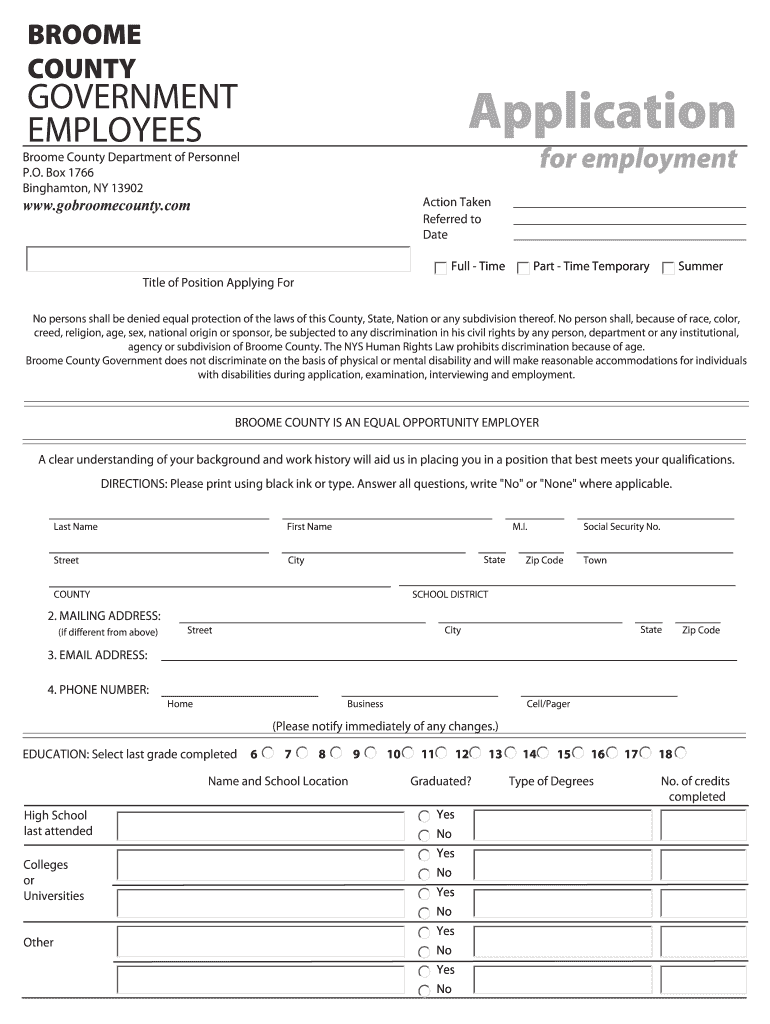 BROOKE COUNTY GOVERNMENT EMPLOYEES Application for employment Brooke County Department of Personnel P.O. Box 1766 Binghamton, NY 13902 www.gobroomecounty.com Action Taken Referred to Date Full Time
