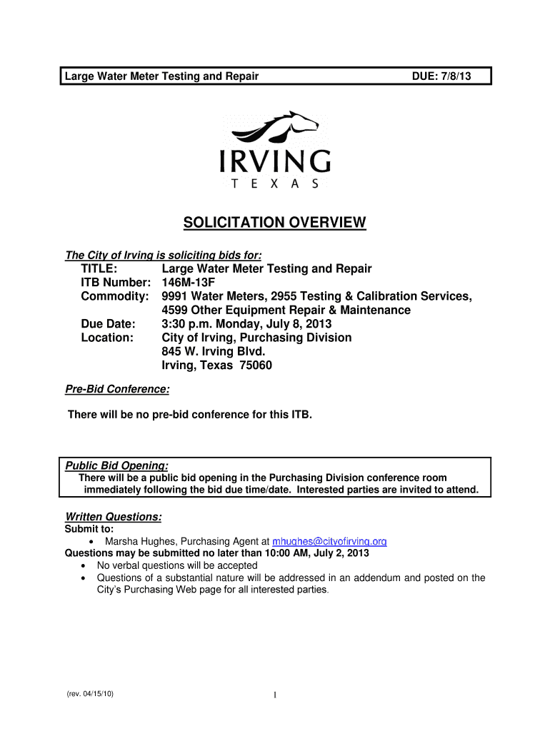 Large Water Meter Testing and Repair DUE: 7/8/13 SOLICITATION OVERVIEW The City of Irving is soliciting bids for: TITLE: Large Water Meter Testing and Repair ITB Number: 146M-13F Commodity: 9991 Water