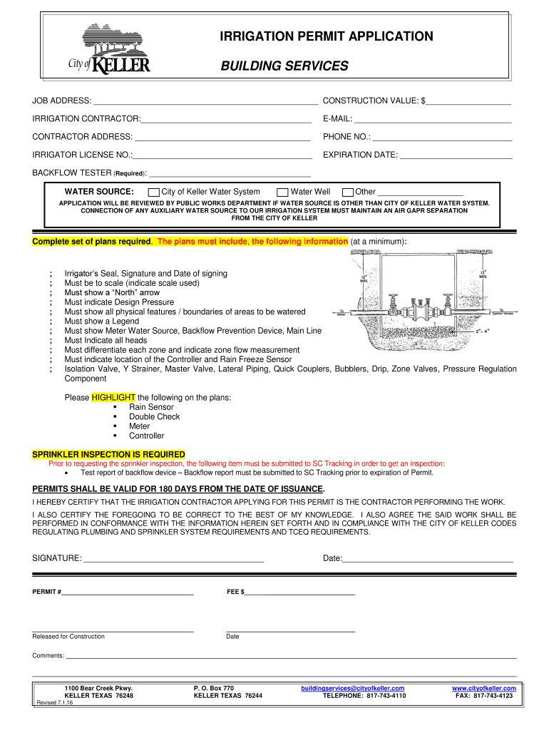 IRRIGATION PERMIT APPLICATION BUILDING SERVICES JOB ADDRESS: CONSTRUCTION VALUE: $ IRRIGATION CONTRACTOR: EMAIL: CONTRACTOR ADDRESS: PHONE NO.: IRRIGATION LICENSE NO.: EXPIRATION DATE: BACKFLOW TESTER