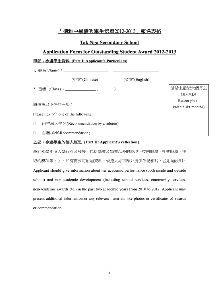 20122013 Take NGA Secondary School Application Form for Outstanding Student Award 20122013 (Part I: Applicants Particulars) 1. (Name) ()(Chinese)()(English)2. (Class) () Recent photo(within six months)Please