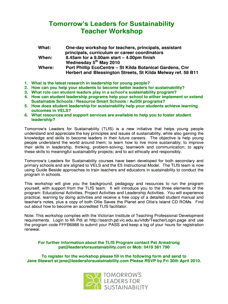 Tomorrow's Leaders for Sustainability Teacher Workshop What: When: Where:One day workshop for teachers, principals, assistant principals, curriculum or career coordinators 8.45am for a 9.00am start