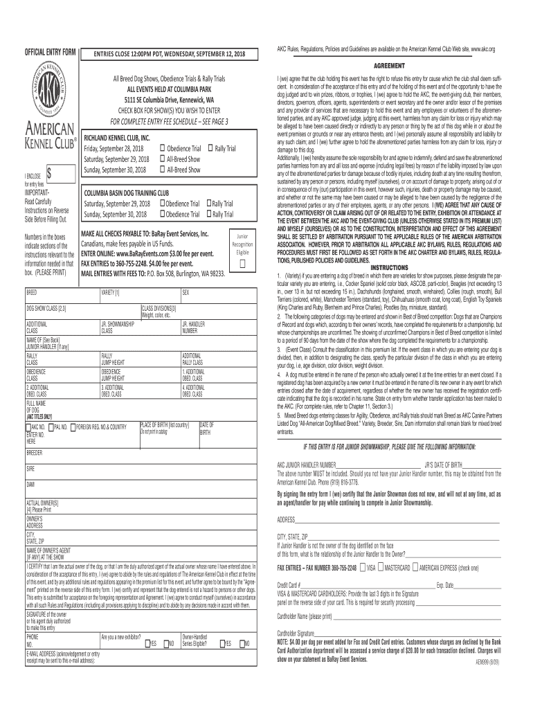 OFFICIAL ENTRY COMMENTARIES CLOSE 12:00PM PDT, WEDNESDAY, SEPTEMBER 12, 2018AKC Rules, Regulations, Policies and Guidelines are available on the American Kennel Club Website, www.akc.org Agreement