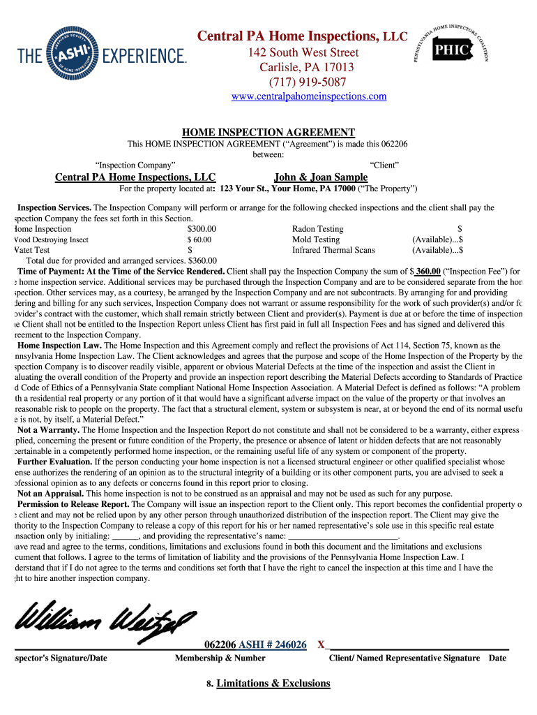 Both the inspector and the client must provide their signatures on the Pennsylvania Home Inspection Agreement for it to be legally binding.