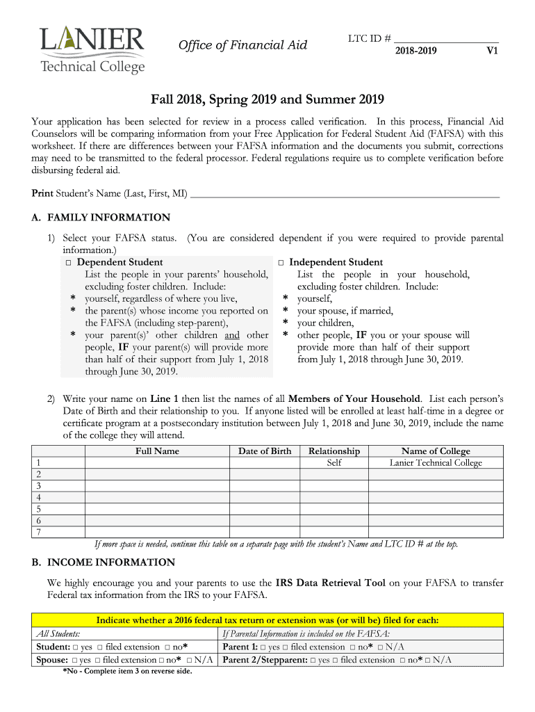 Office of Financial Adult ID # 20182019 V1Fall 2018, Spring 2019 and Summer 2019 Your application has been selected for review in a process called verification. In this process, Financial Aid Counselors