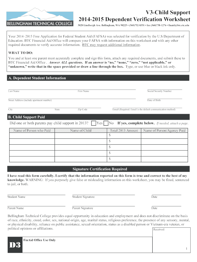 The 2014-2015 Dependent Verification Worksheet is a financial aid document used by Bellingham Technical College to verify FAFSA information for students and their parents.
