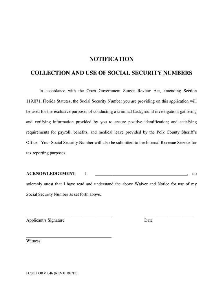 Get the free NOTIFICATION COLLECTION AND USE OF SOCIAL SECURITY NUMBERS - polksheriff