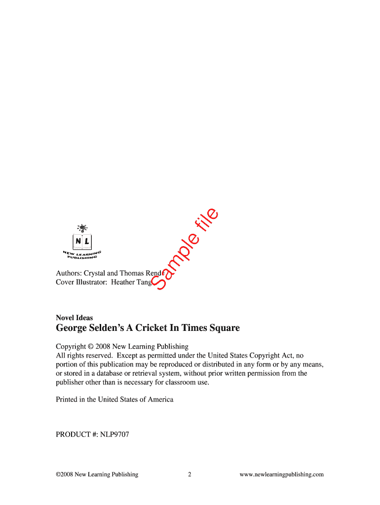 Key Features of the Novel Study Guide for A Cricket In Times Square