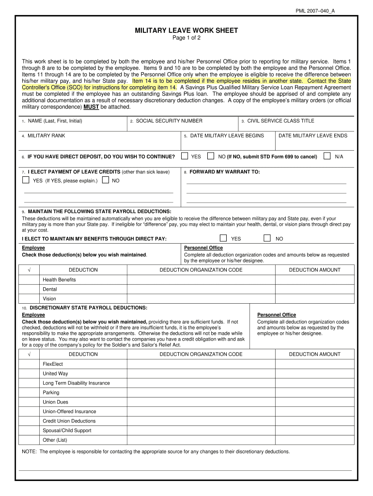 PML 2007040 A MILITARY LEAVE WORK SHEET Page 1 of 2 This work sheet is to be completed by both the employee and his/her Personnel Office prior to reporting for military service. Items 1 through 8