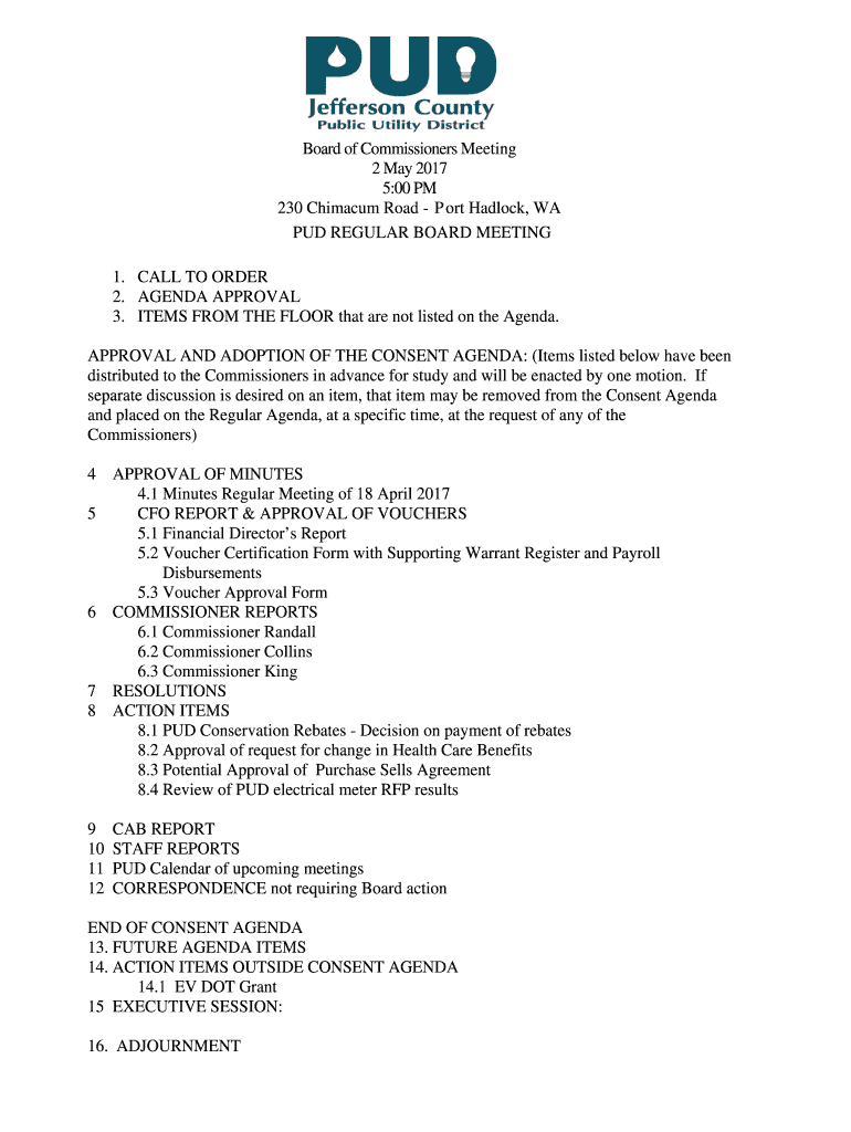 Board of Commissioners Meeting 2 May 2017 5:00 PM 230 Cimabue Road Port Haddock, WA PUD REGULAR BOARD MEETING 1. CALL TO ORDER 2. AGENDA APPROVAL 3. ITEMS FROM THE FLOOR that are not listed on the