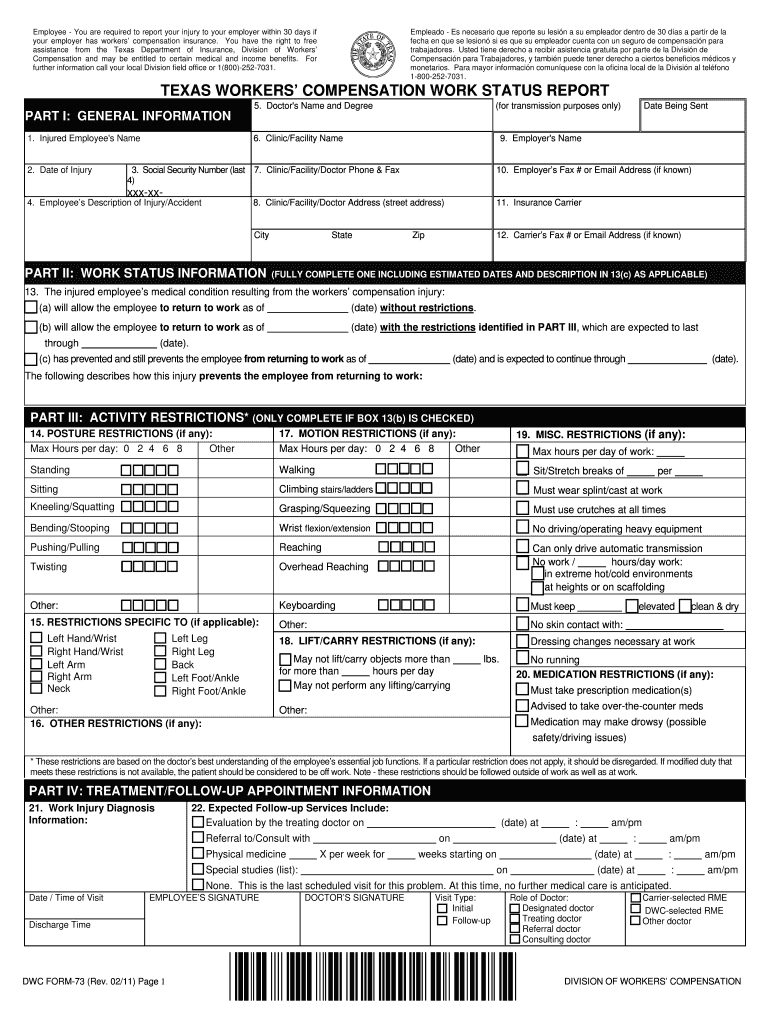 Get the free TEXAS WORKERS COMPENSATION WORK STATUS REPORT