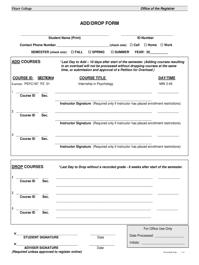 Spitzer CollegeOffice of the Registrar ADD/DROP FORM Student Name (Print) ID NumberContact Phone Number (check one): Cell SEMESTER (check one):ADD COURSESCOURSE ID Example: FALL SPRING SUMMER Home