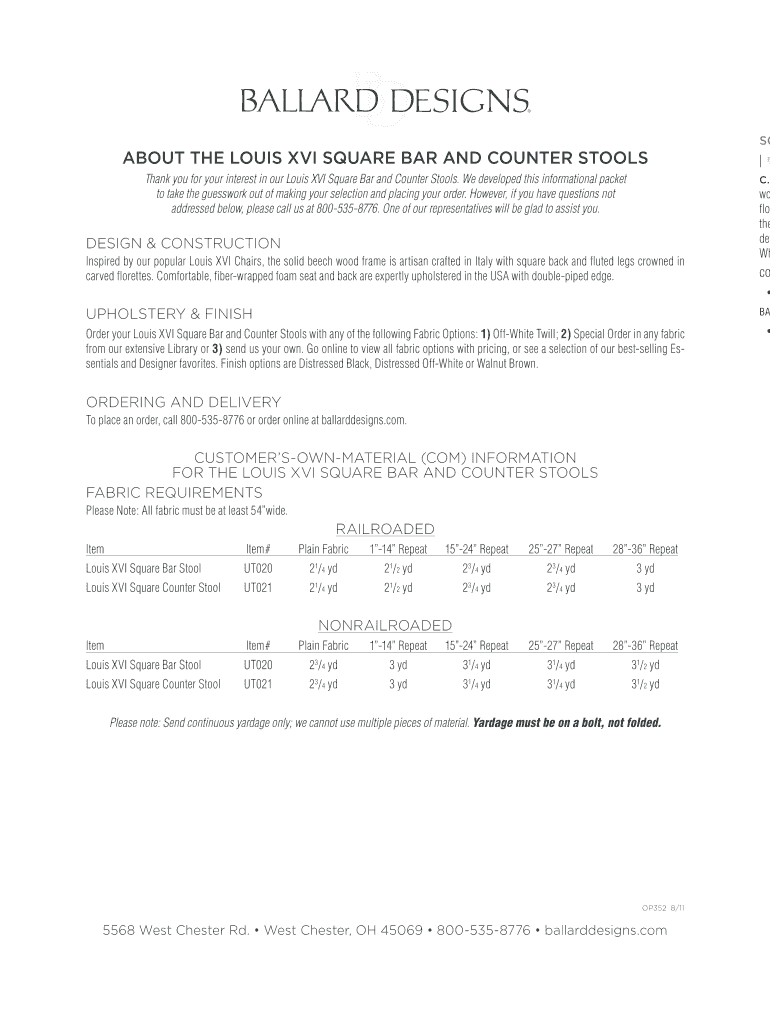 ABOUT THE LOUIS XVI SQUARE BAR AND COUNTER STOOLS Thank you for your interest in our Louis XVI Square Bar and Counter Stools. We developed this informational packet to take the guesswork out of making
