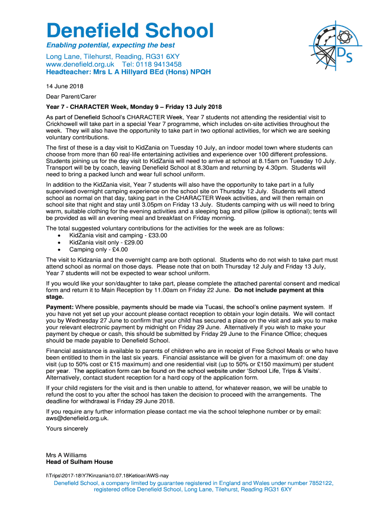 Minefield School Enabling potential, expecting the best Long Lane, Tilers, Reading, RG31 6XY www.denefield.org.uk Tel: 0118 9413458 Headteacher: Mrs L A Hill yard Bed (Hons) MPH 14 June 2018 Dear