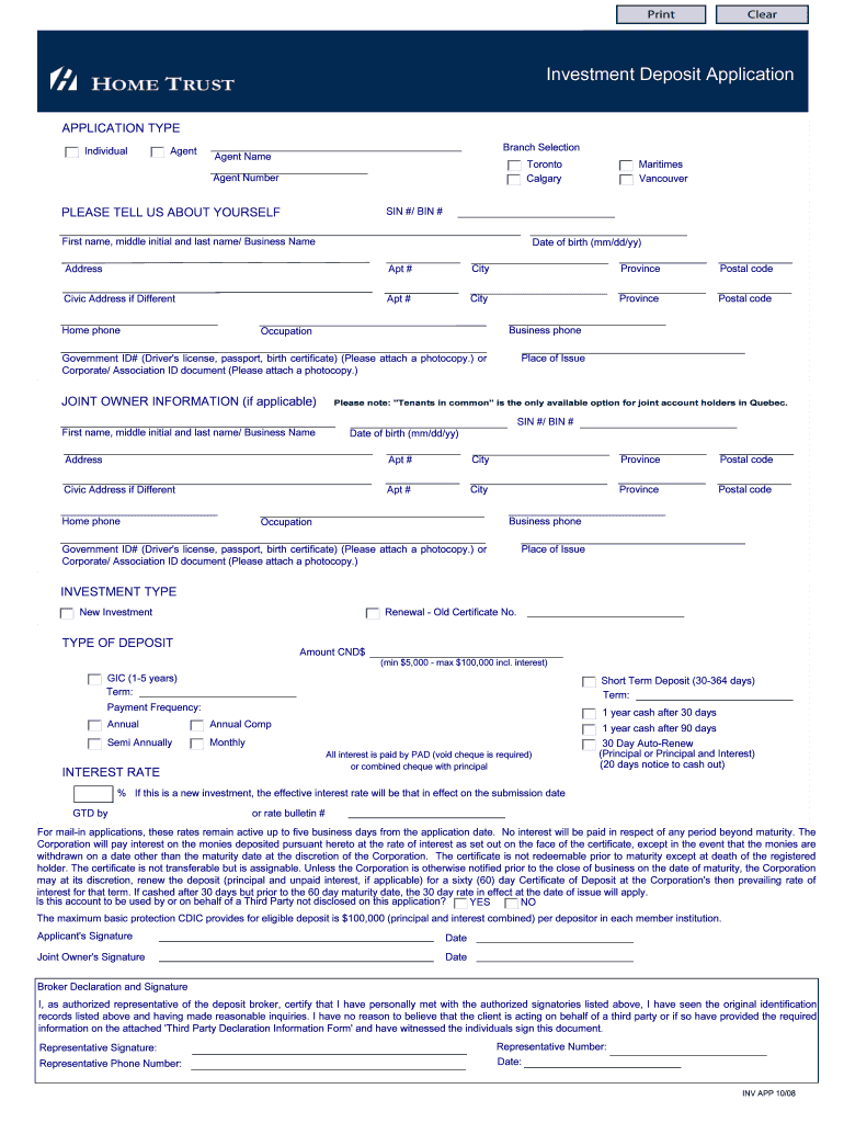 This form can be completed by individual applicants, joint owners, and brokers who are interested in applying for an investment deposit with a financial institution.
