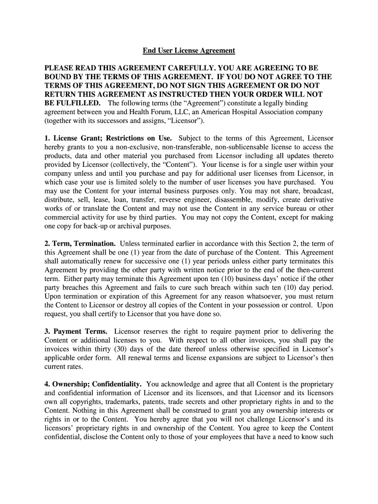 The End User License Agreement (EULA) is a legal document that establishes the terms and conditions between Health Forum, LLC and users regarding the access and utilization of software and content. This agreement is crucial as it defines the proper use of the product, ensuring that users adhere to the expected legal framework. Governed by the laws of Illinois, a valid EULA provides a foundation for the protection of both intellectual property and user rights.