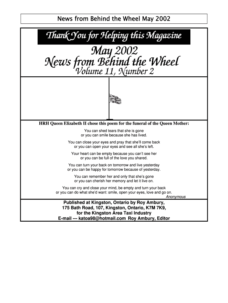 News from Behind the Wheel May 2002 HRH Queen Elizabeth II chose this poem for the funeral of the Queen Mother: You can shed tears that she is gone, or you can smile because she has lived. You can