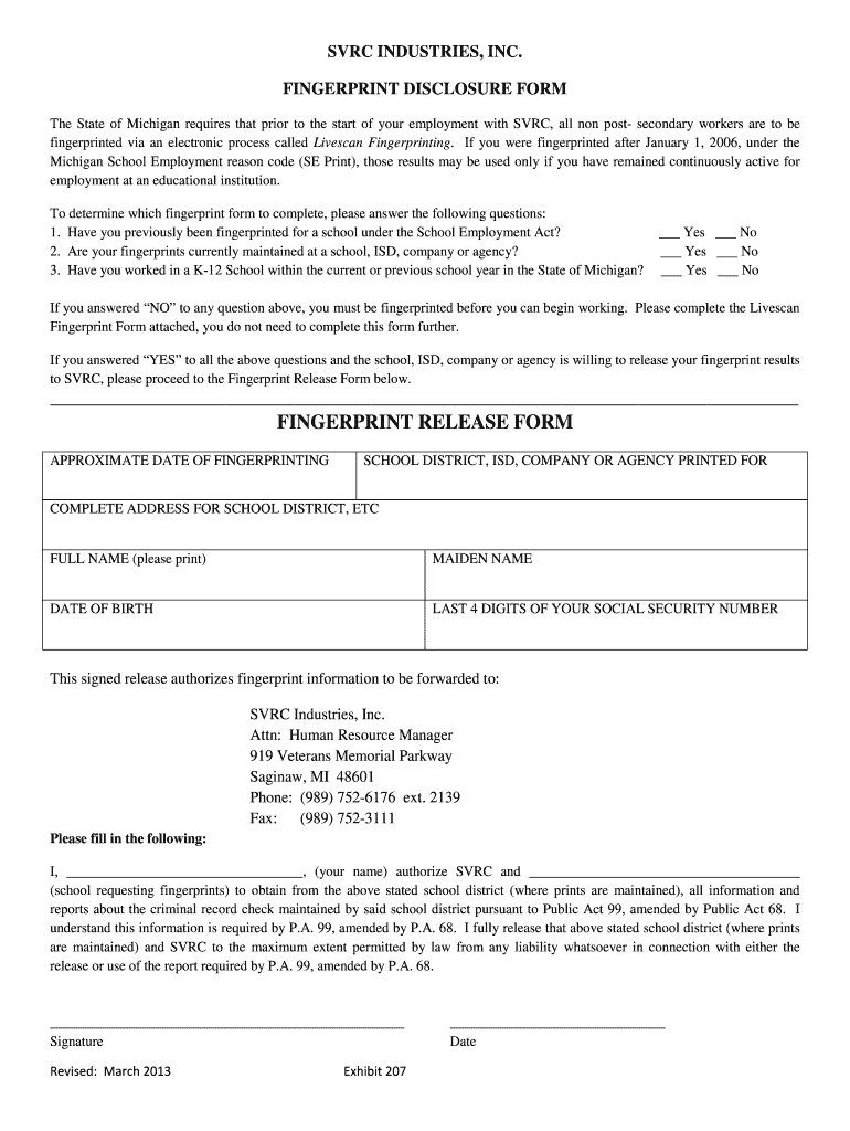 Get the free FINGERPRINT RELEASE FORM - svrcindustries