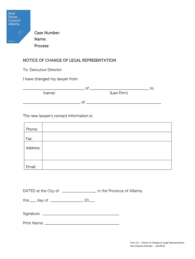 Case Number: Name: Process:NOTICE OF CHANGE OF LEGAL REPRESENTATION To: Executive Director I have changed my lawyer from of to (name) (Law Firm) of The new lawyers contact information is: Phone: Fax: