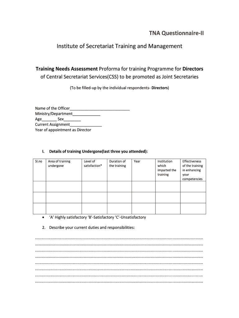 TNAQuestionnaireII InstituteofSecretariatTrainingandManagement TrainingNeedsAssessmentProformafortrainingProgrammeforDirectors ofCentralSecretariatServices(CSS)tobepromotedasJointSecretaries (TobefilledupbytheindividualrespondentsDirectors)