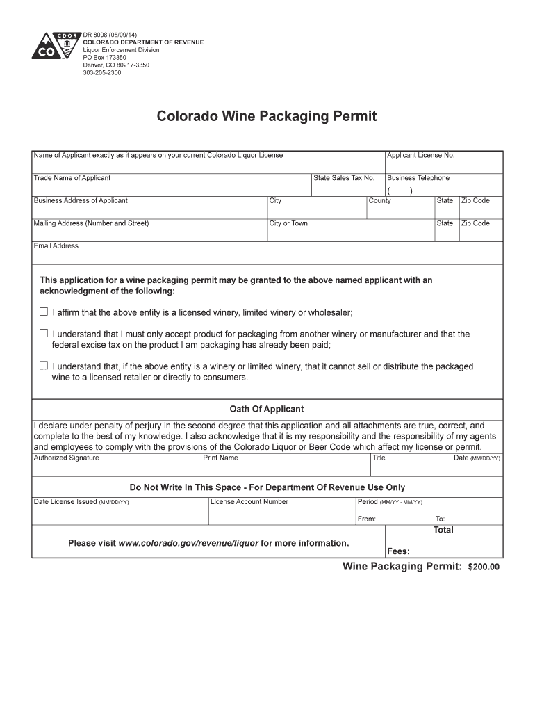 Any individual or business that packages wine in Colorado is required to file for a Colorado wine packaging permit.