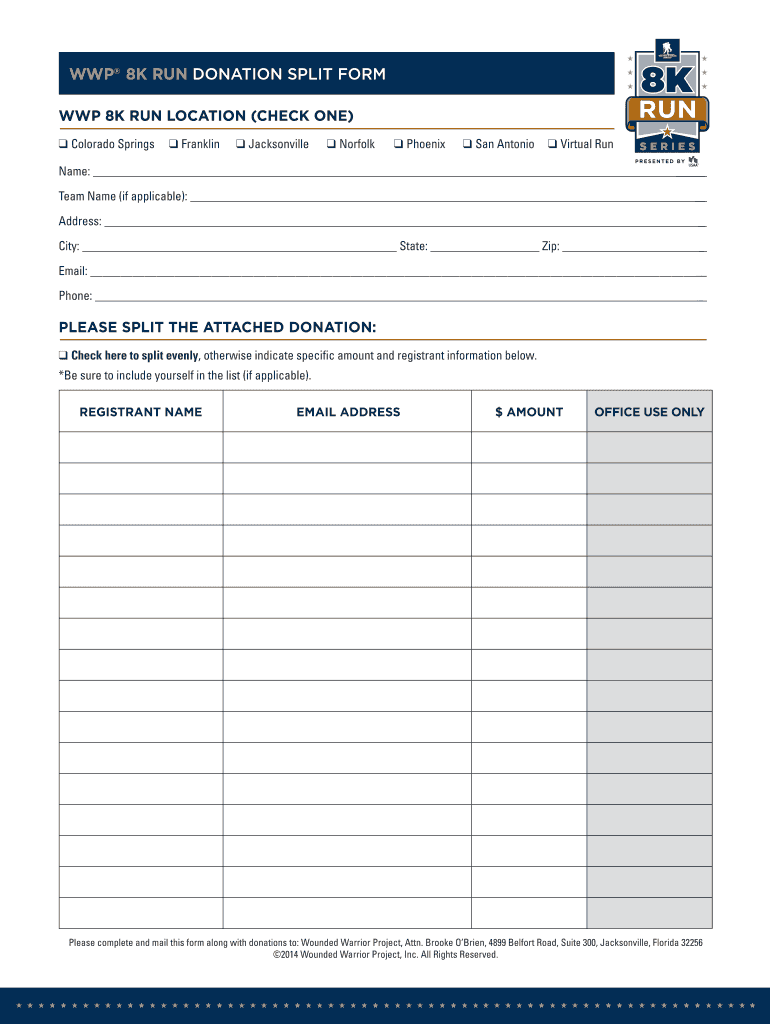 The WWP 8K Run Donation Split Form is a personal form used by participants of the Wounded Warrior Project's 8K run event to split donations among registrants.