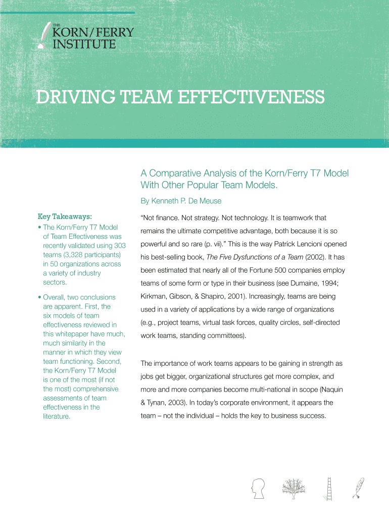 DRIVING TEAM EFFECTIVENESS Comparative Analysis of the Born/Ferry T7 Model With Other Popular Team Models. By Kenneth P. De Meuse Key Takeaways: The Born/Ferry T7 Model of Team Effectiveness was recently