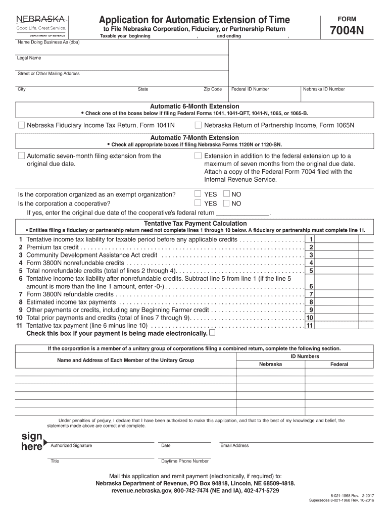 Application for Automatic Extension of TimeFORM7004Nto File Nebraska Corporation, Fiduciary, or Partnership Returnable year beginning, and ending, Name Doing Business As (DBA)RESETLegal NamePRINTStreet