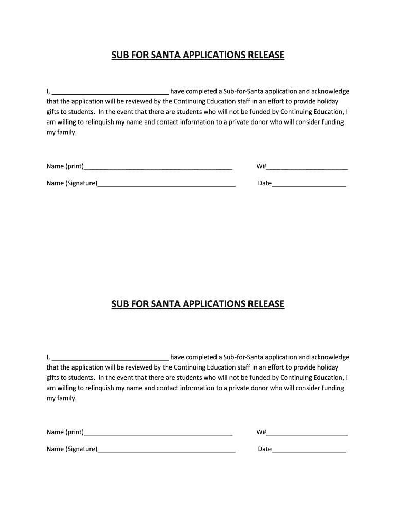 SUB FOR SANTA APPLICATIONS RELEASED, have completed a SubforSanta application and acknowledge that the application will be reviewed by the Continuing Education staff in an effort to provide holiday