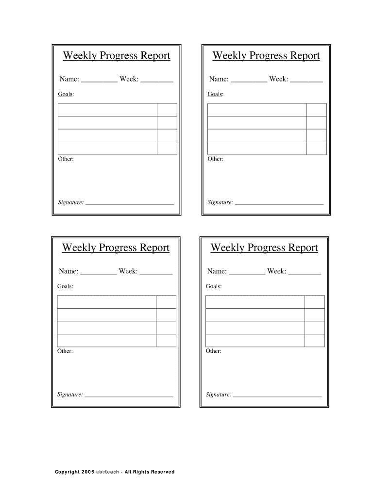 The Weekly Progress Report should be filled out by employees who need to document their weekly achievements and progress. Managers may also use it for performance evaluations.
