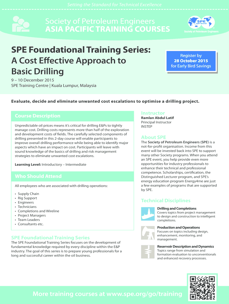 Setting the Standard for Technical ExcellenceSociety of Petroleum Engineers ASIA PACIFIC TRAINING COURSES SPE Foundational Training Series: A Cost Effective Approach to Basic DrillingRegister by 28