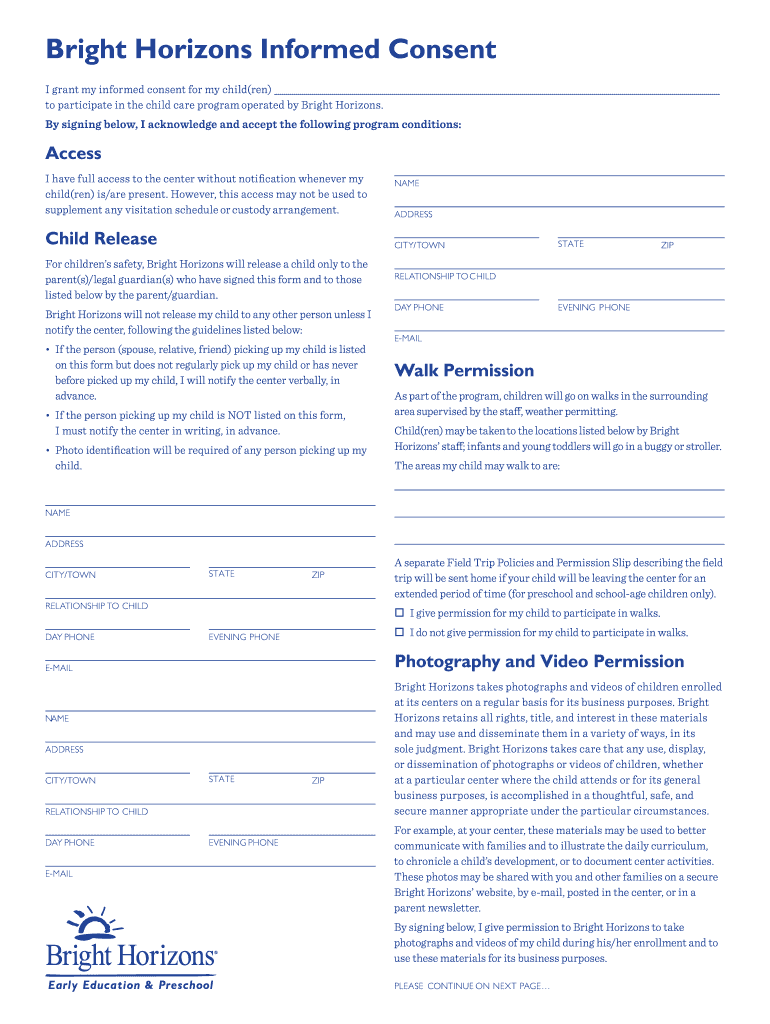 The Bright Horizons Informed Consent Form is a child care consent document used by parents or guardians to grant permission for their child to participate in Bright Horizons' programs.