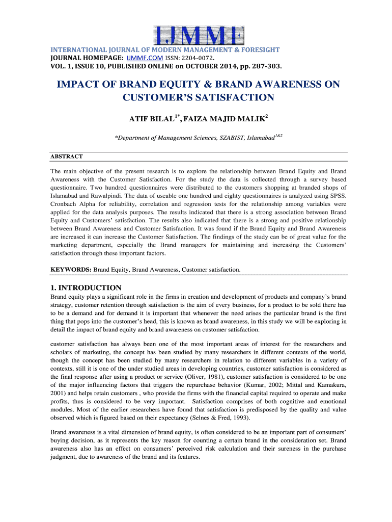 INTERNATIONAL JOURNAL OF MODERN MANAGEMENT & FORESIGHT JOURNAL HOMEPAGE: IJMMF.COM ISSN: 22040072. VOL. 1, ISSUE 10, PUBLISHED ONLINE on OCTOBER 2014, pp. 287303.IMPACT OF BRAND EQUITY & BRAND AWARENESS