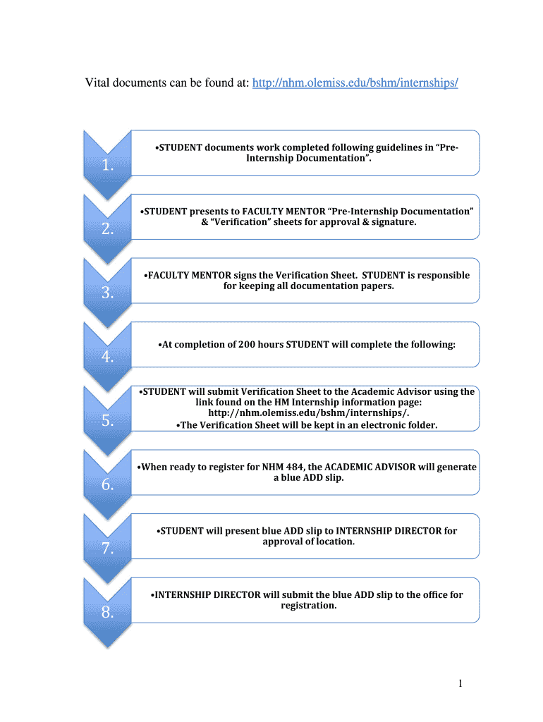 Vital documents can be found at: http://nhm.olemiss.edu/bshm/internships/1.2.3.4.5.6.7.8.STUDENT documents work completed following guidelines in PRE Internship Documentation. STUDENT presents to