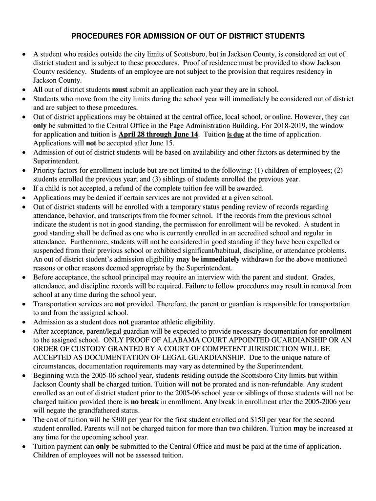 PROCEDURES FOR ADMISSION OF OUT OF DISTRICT STUDENTS A student who resides outside the city limits of Scottsboro, but in Jackson County, is considered an out of district student and is subject to