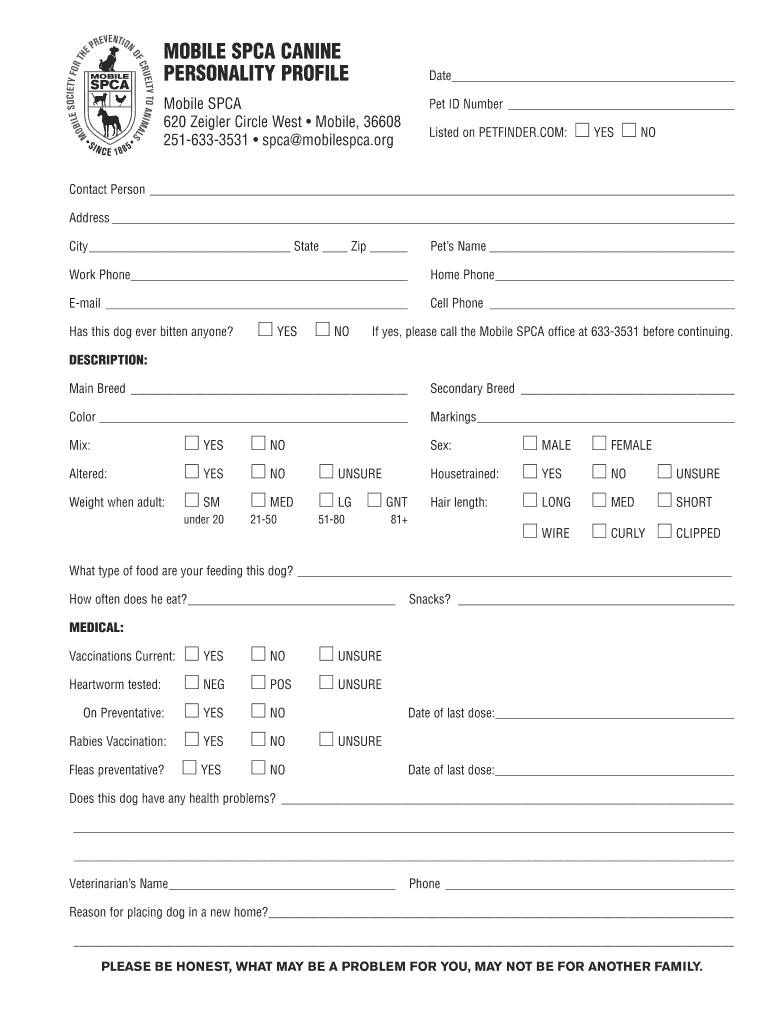 MOBILE SPCA CANINE PERSONALITY PROFILE Date Mobile SPCA 620 Ziegler Circle West Mobile, 36608 251-633-3531 SPCA mobiles.org Pet ID Number Listed on PETFINDER.COM: YES NO Contact Person Address City