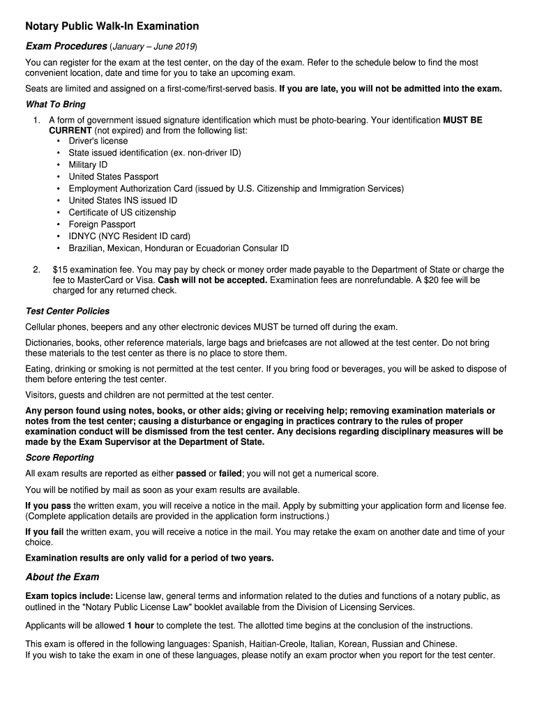 Notary Public Walking Examination Exam Procedures (January June 2019) You can register for the exam at the test center, on the day of the exam. Refer to the schedule below to find the most convenient