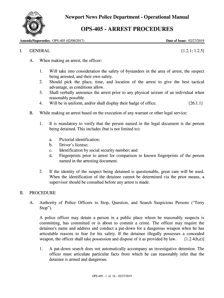 Newport News Police Department Operational ManualOPS405 ARREST PROCEDURES Amends/Supersedes: OPS405 (02/08/2017)I.GENERAL A.2. 3. 4. B. 1.2.1; 1.2.5 When making an arrest, the officer: 1. Will take