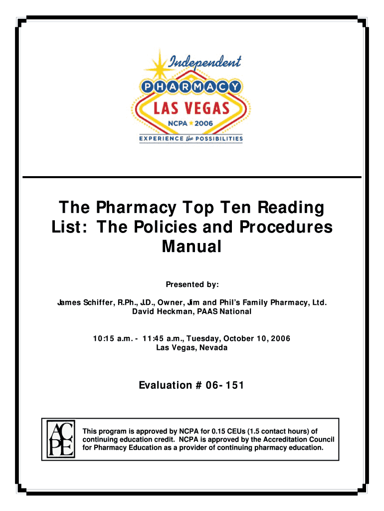 The Pharmacy Top Ten Reading List: The Policies and Procedures Manual Presented by: James Stiffer, R. pH., J.D., Owner, Jim and Phil's Family Pharmacy, Ltd. David Hickman, PAAs National 10:15 a.m.