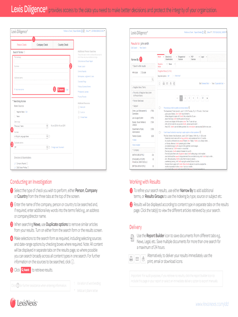 Lexis Diligence provides access to the data you need to make better decisions and protect the integrity of your organization. Conducting an InvestigationWorking with Results1Select the type of check
