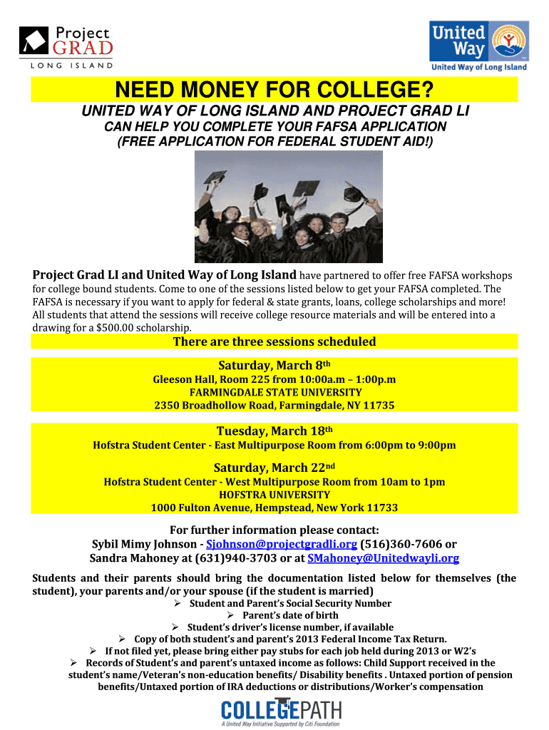 The FAFSA Application Assistance Workshop is a free event designed to assist college-bound students in completing their Free Application for Federal Student Aid (FAFSA). Organized by Project Grad LI and United Way of Long Island, the workshop emphasizes the importance of completing the FAFSA to access financial aid resources for college. Understanding the FAFSA is crucial for students aiming to receive federal and state grants, loans, and scholarships.