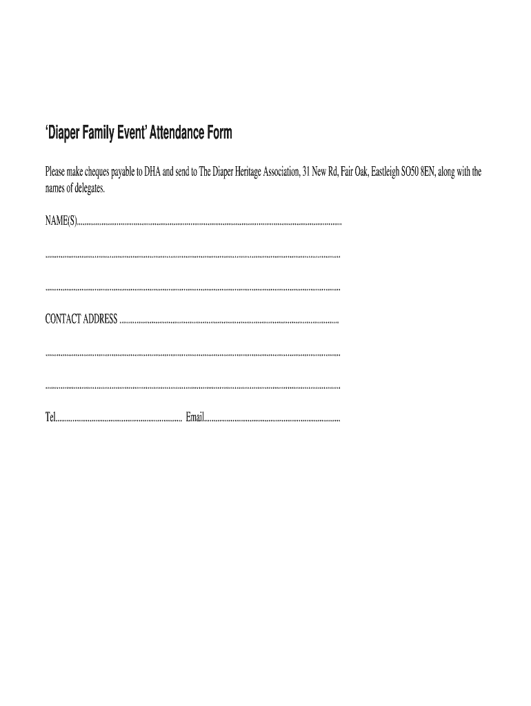 Diaper Family Event Attendance Form Please make checks payable to DHA and send to The Diaper Heritage Association, 31 New Rd, Fair Oak, Ashleigh SO50 8 EN, along with the names of delegates. NAME(S)............................................................................................................................................
