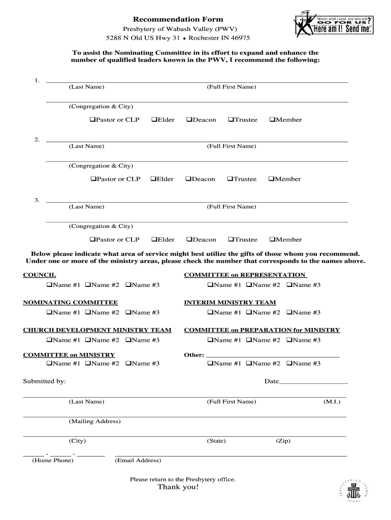 Recommendation Form Presbytery of Wabash Valley (PSV) 5288 N Old US Hwy 31 ? Rochester IN 46975 To assist the Nominating Committee in its effort to expand and enhance the number of qualified leaders
