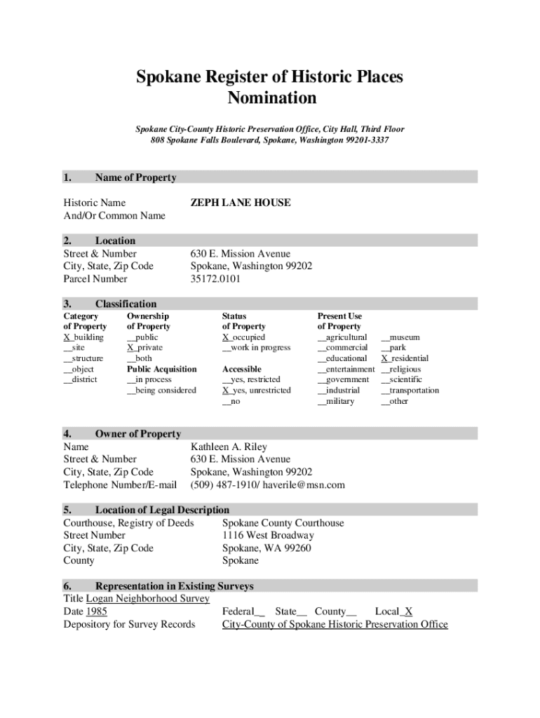 Get the free Nomination (PDF) - Historic Spokane - Historic Preservation Office - properties hist...