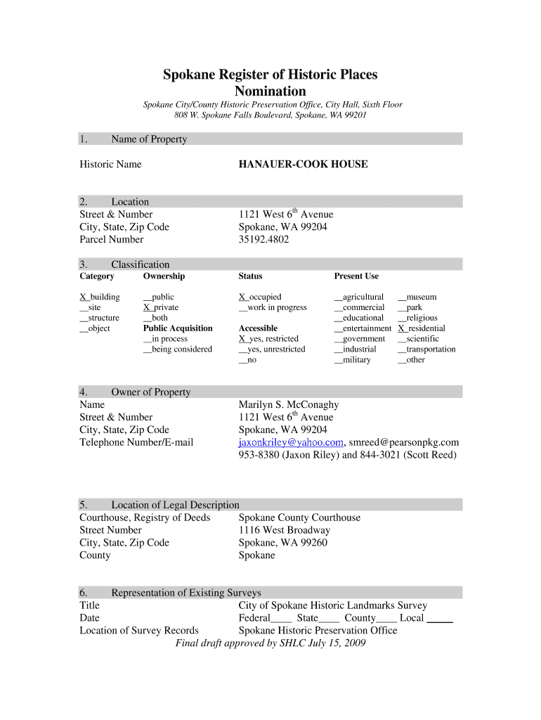 Spokane Register of Historic Places Nomination Spokane City/County Historic Preservation Office, City Hall, Sixth Floor 808 W. Spokane Falls Boulevard, Spokane, WA 992011. Name of PropertyHistoric