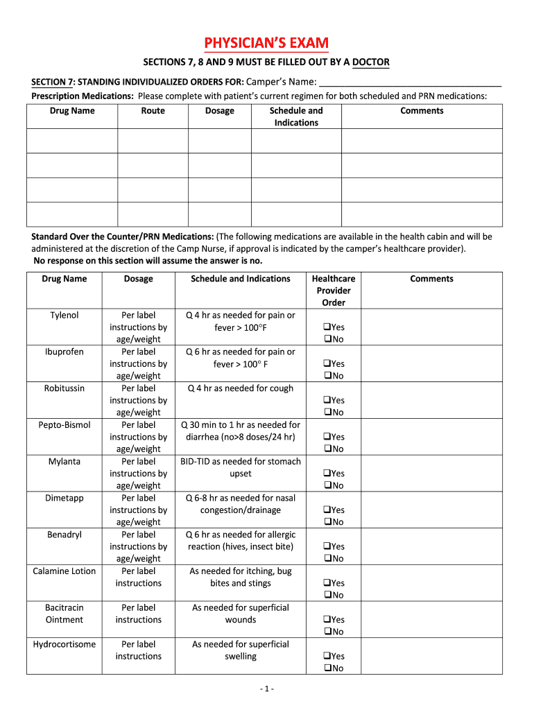 PHYSICIANS EXAM SECTIONS 7, 8 AND 9 MUST BE FILLED OUT BY A DOCTOR SECTION 7: STANDING INDIVIDUALIZED ORDERS FOR: Campers Name: Prescription Medications: Please complete with patients current regimen