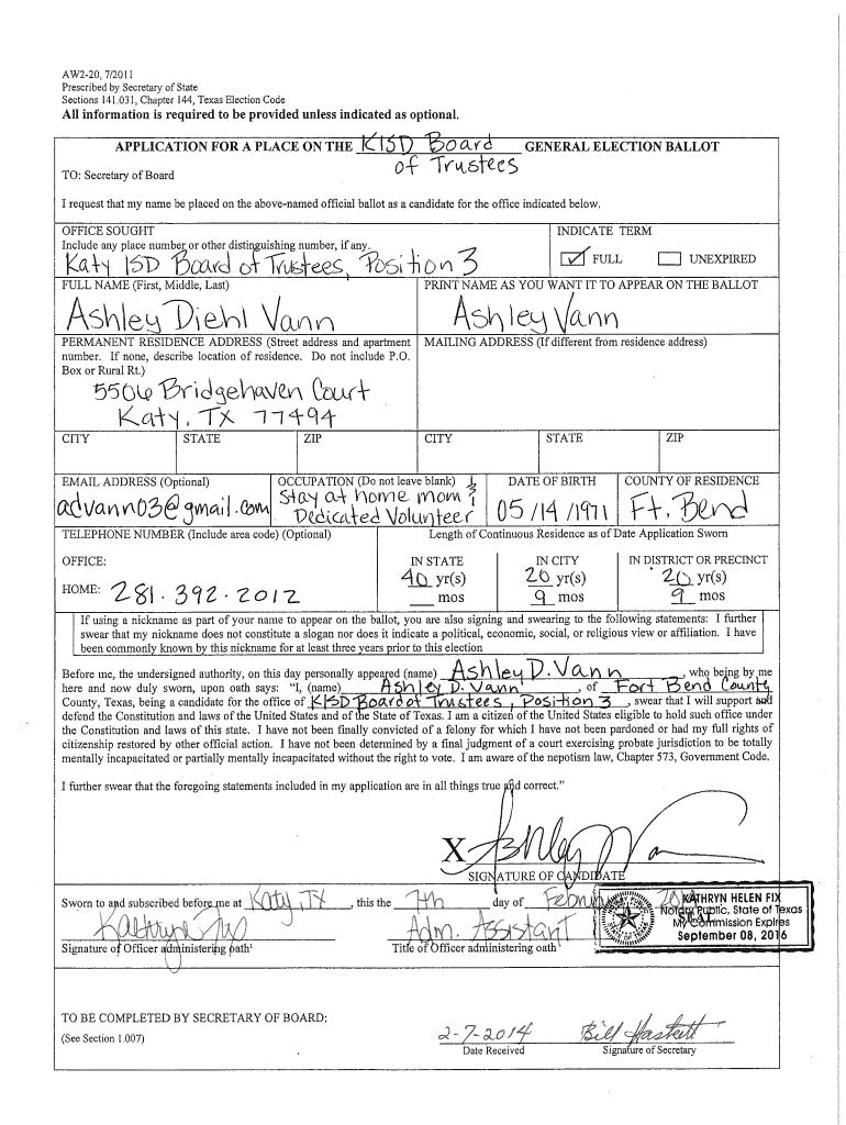 AW220, 7/2011 Prescribed by Secretary of State Sections 141.031, Chapter 144, Texas Election Odell information is required to be provided unless indicated as optional. APPLICATION FOR A PLACE ON THE