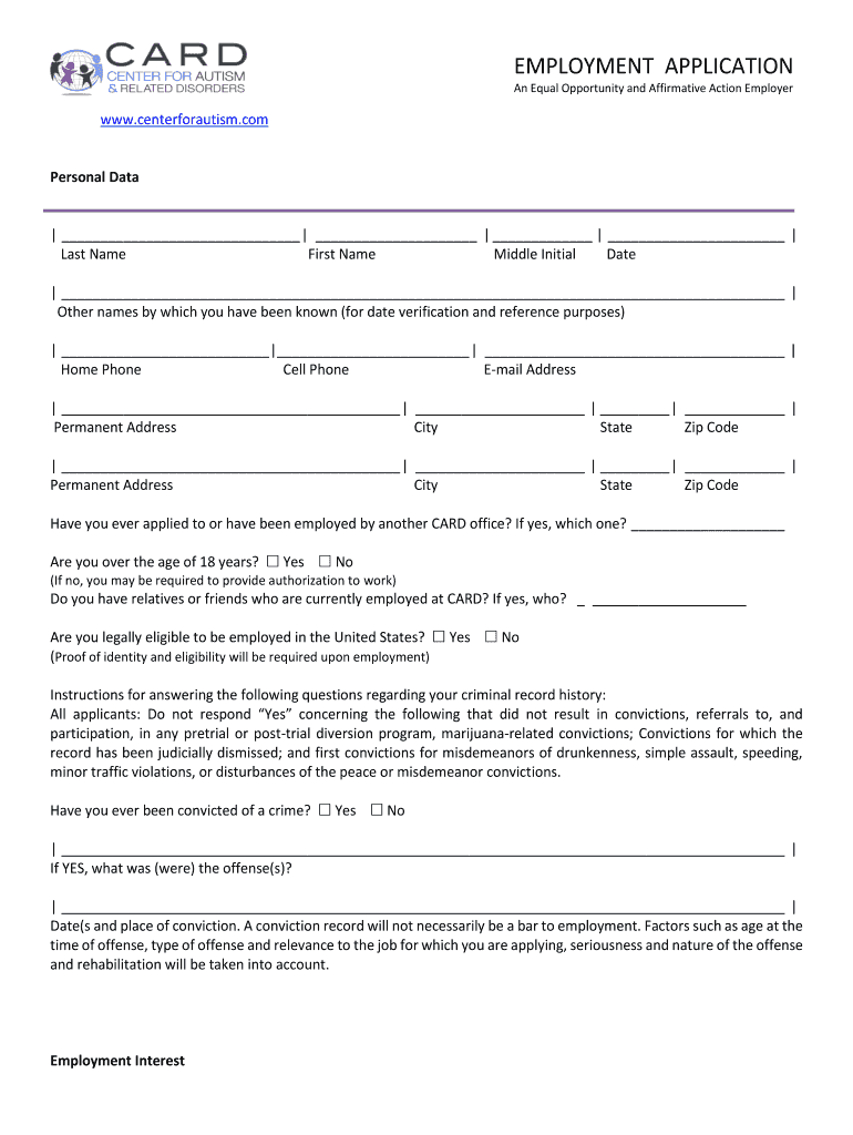 EMPLOYMENT APPLICATION An Equal Opportunity and Affirmative Action Employer.centerforautism.impersonal Data Last Name First Name Middle Initial Date Other names by which you have been known (for date