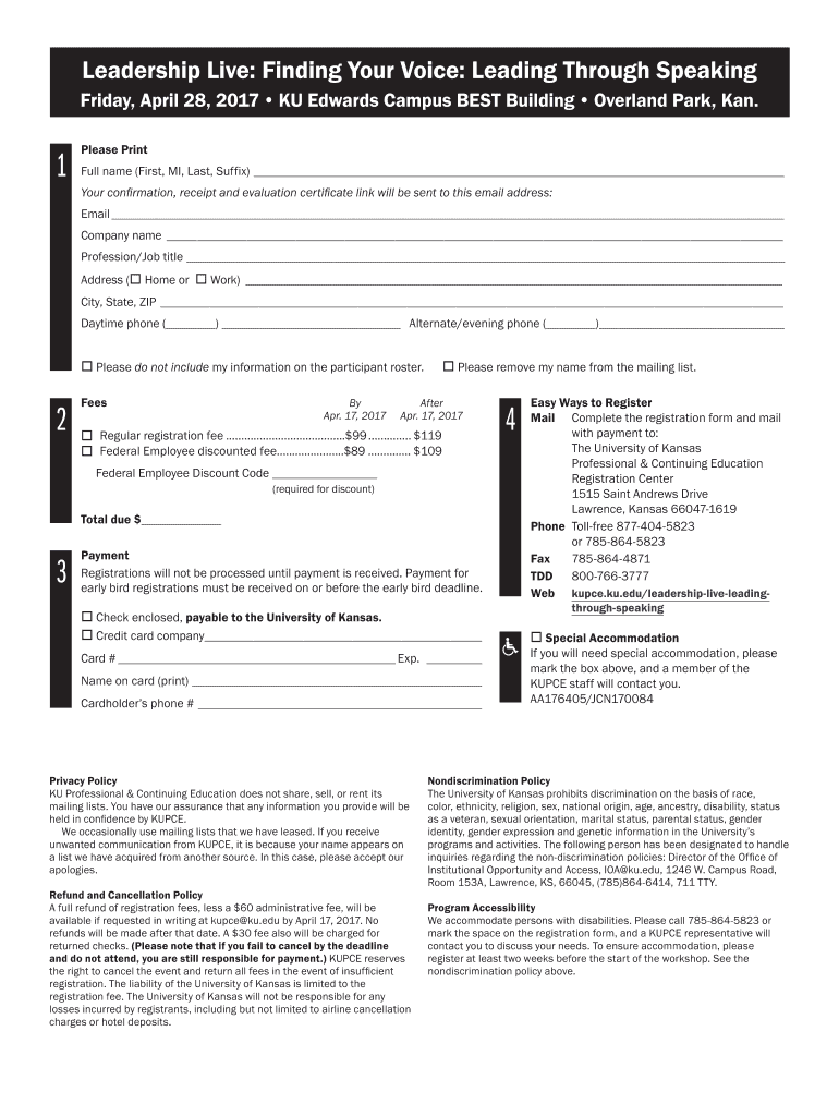 Leadership Live: Finding Your Voice: Leading Through Speaking Friday, April 28, 2017, KU Edwards Campus BEST Building Overland Park, Kan.1Please Print Full name (First, MI, Last, Suffix) Your confirmation,