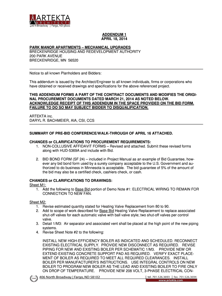 ADDENDUM 1 APRIL 18, 2014, PARK MANOR APARTMENTS MECHANICAL UPGRADES BRECKENRIDGE HOUSING AND REDEVELOPMENT AUTHORITY 200 PARK AVENUE BRECKENRIDGE, MN 56520 Notice to all known Plan holders and Bidders:
