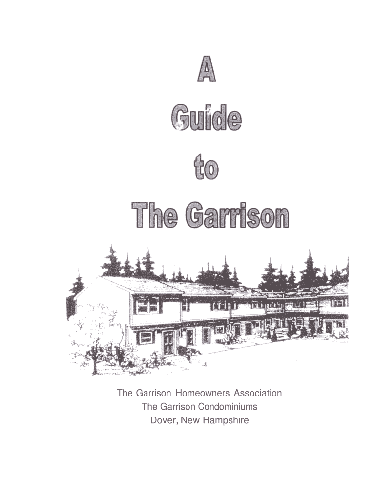 The Garrison Homeowners Association The Garrison Condominiums Dover, New Hampshire TABLE OF CONTENTS WELCOME TO THE GARRISON LETTER THE GARRISON BOARD OF DIRECTORS/MANAGEMENT COMPANY CONDOMINIUM RULES
